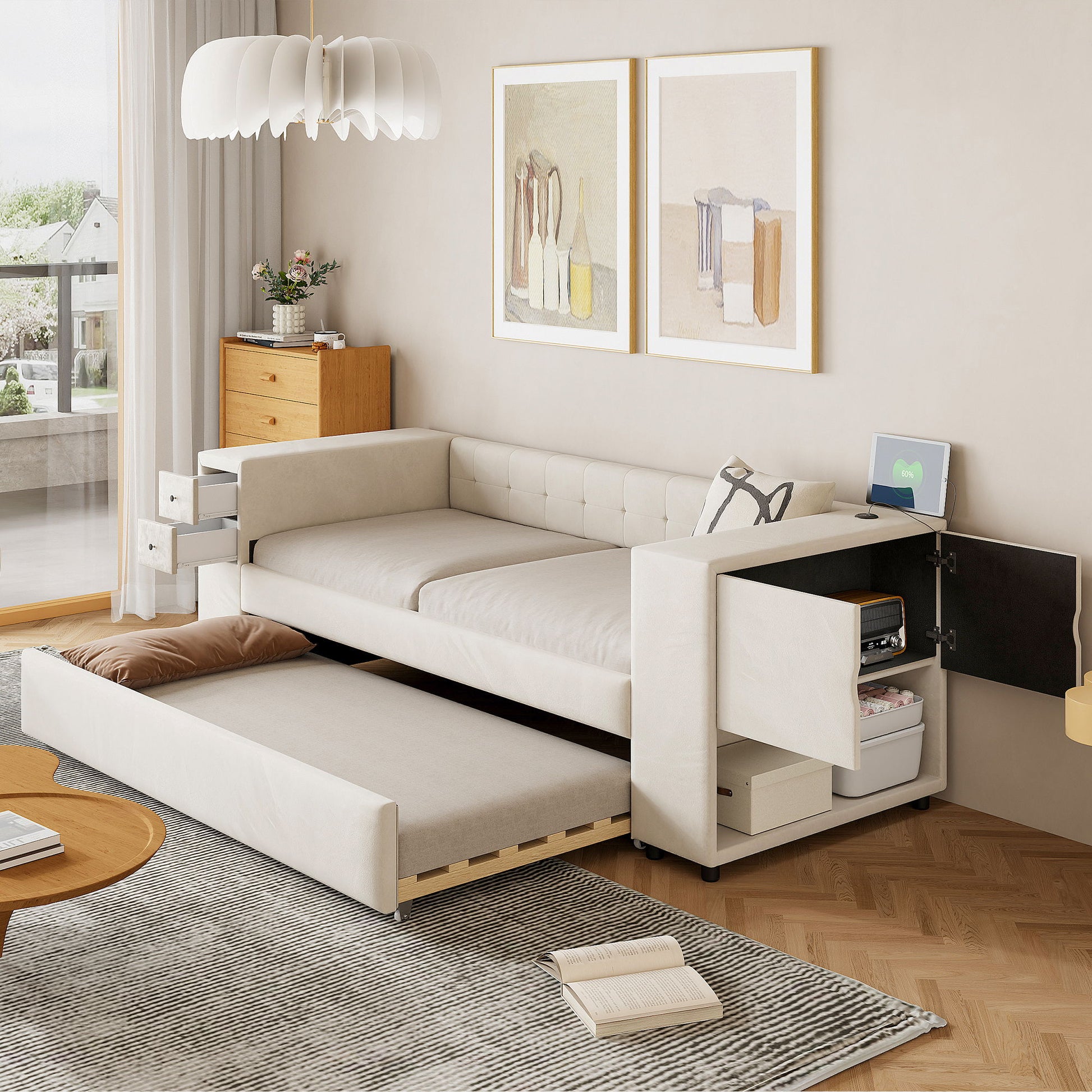 Twin Upholstered Bed With Storage And Twin Trundle, USB Charging Ports - Beige