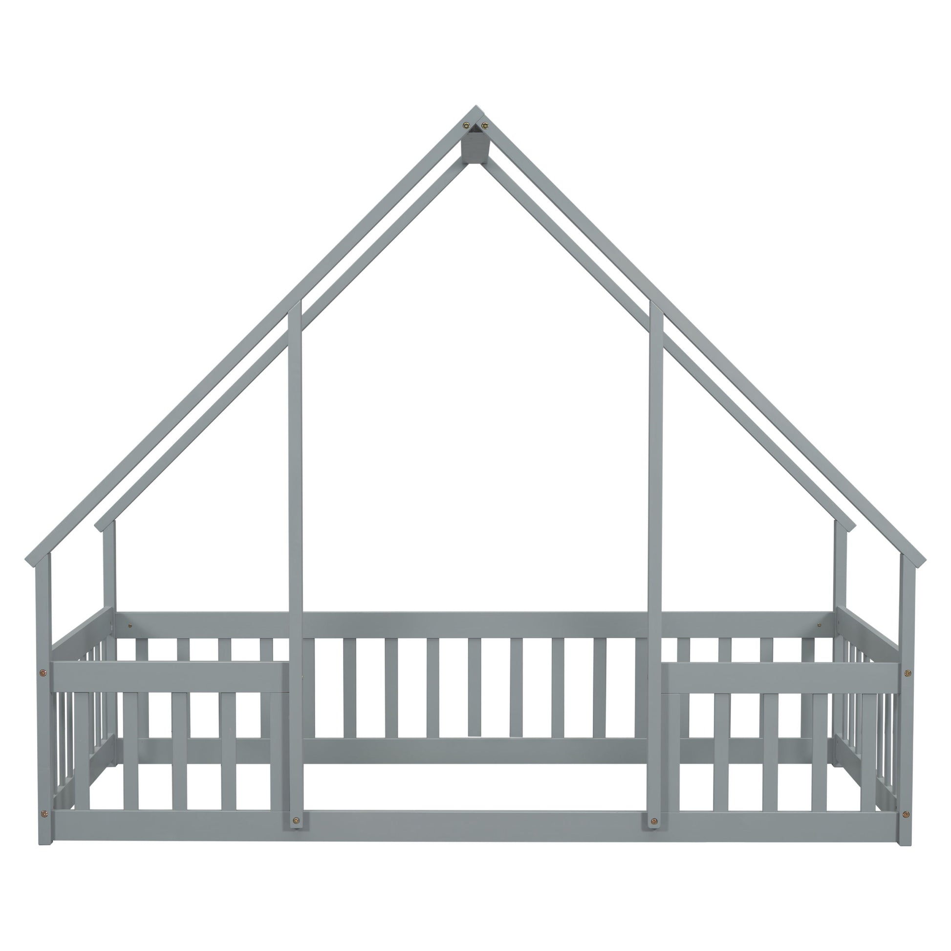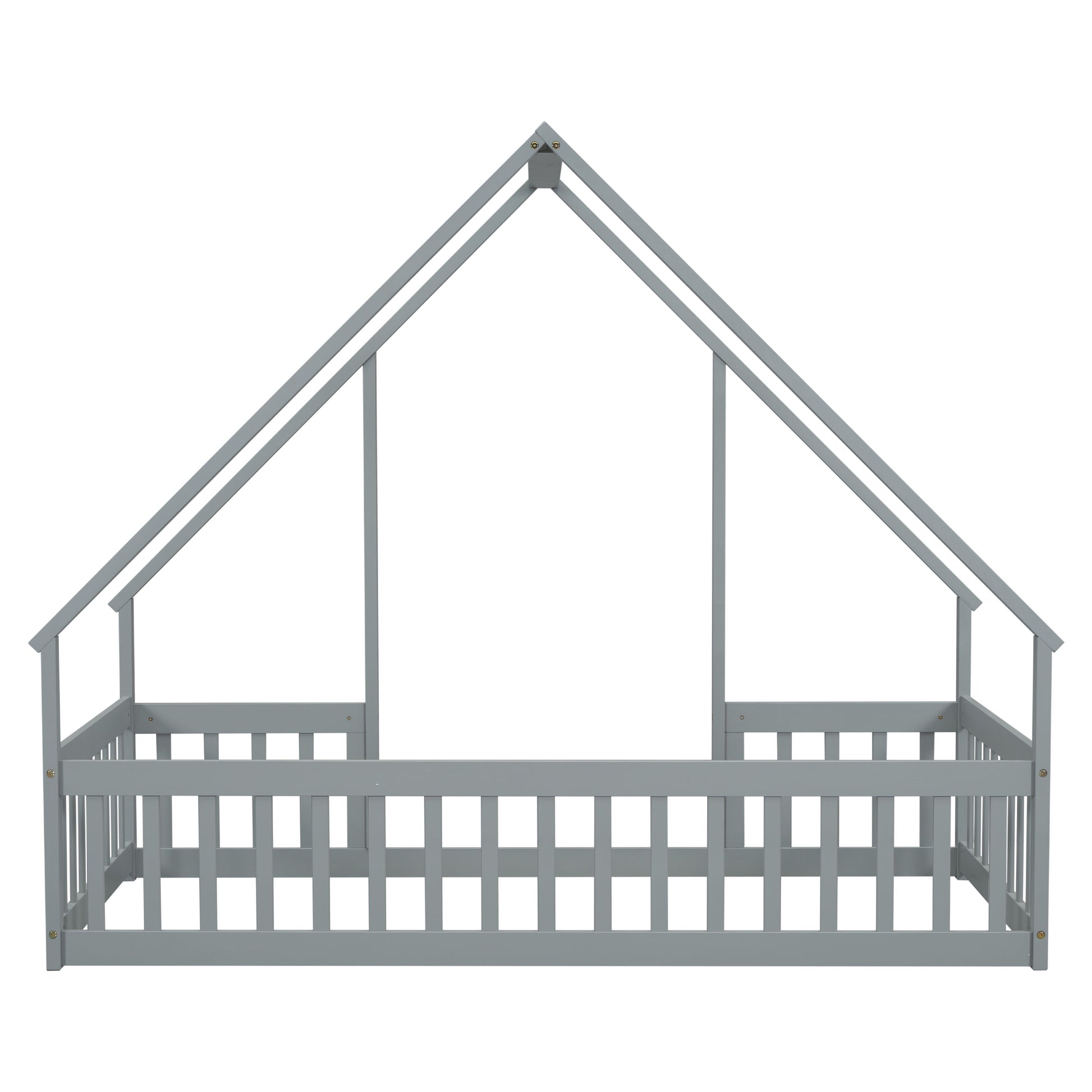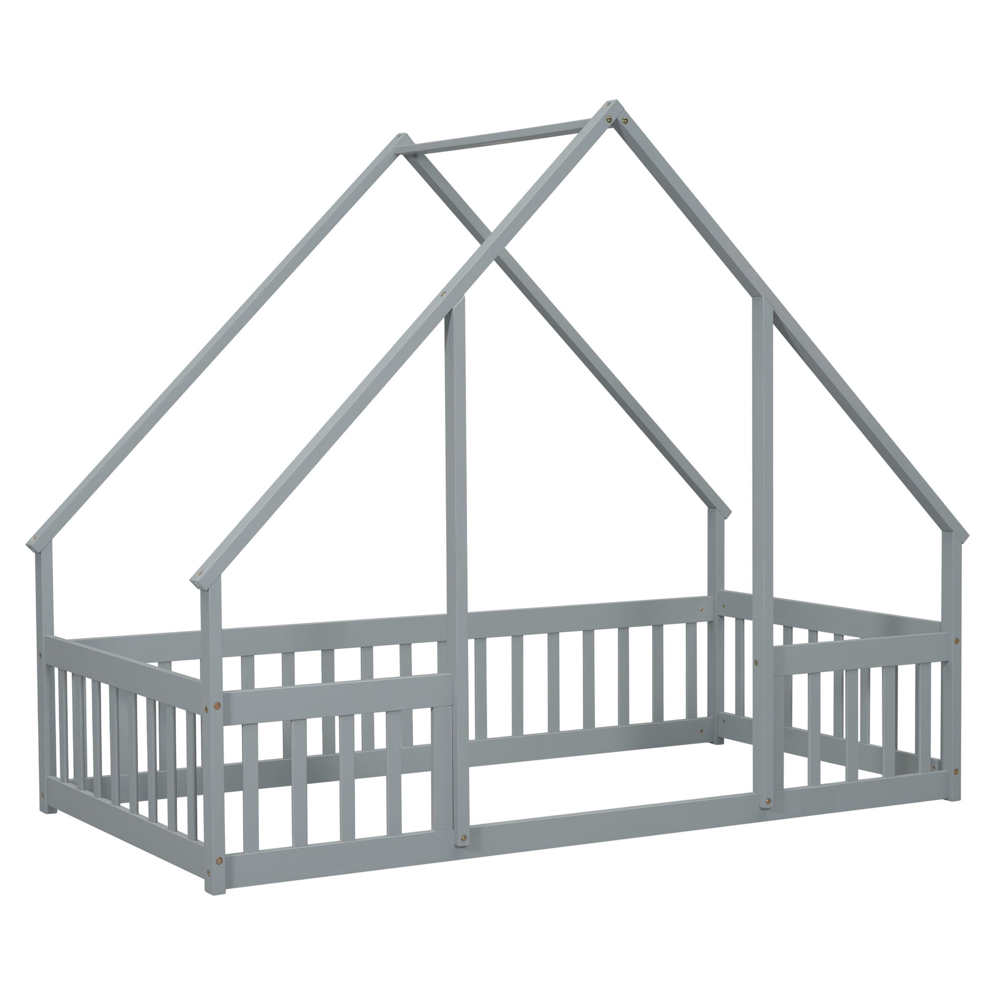Twin Wood House-Shaped Floor Bed With Fence, Guardrails - Gray