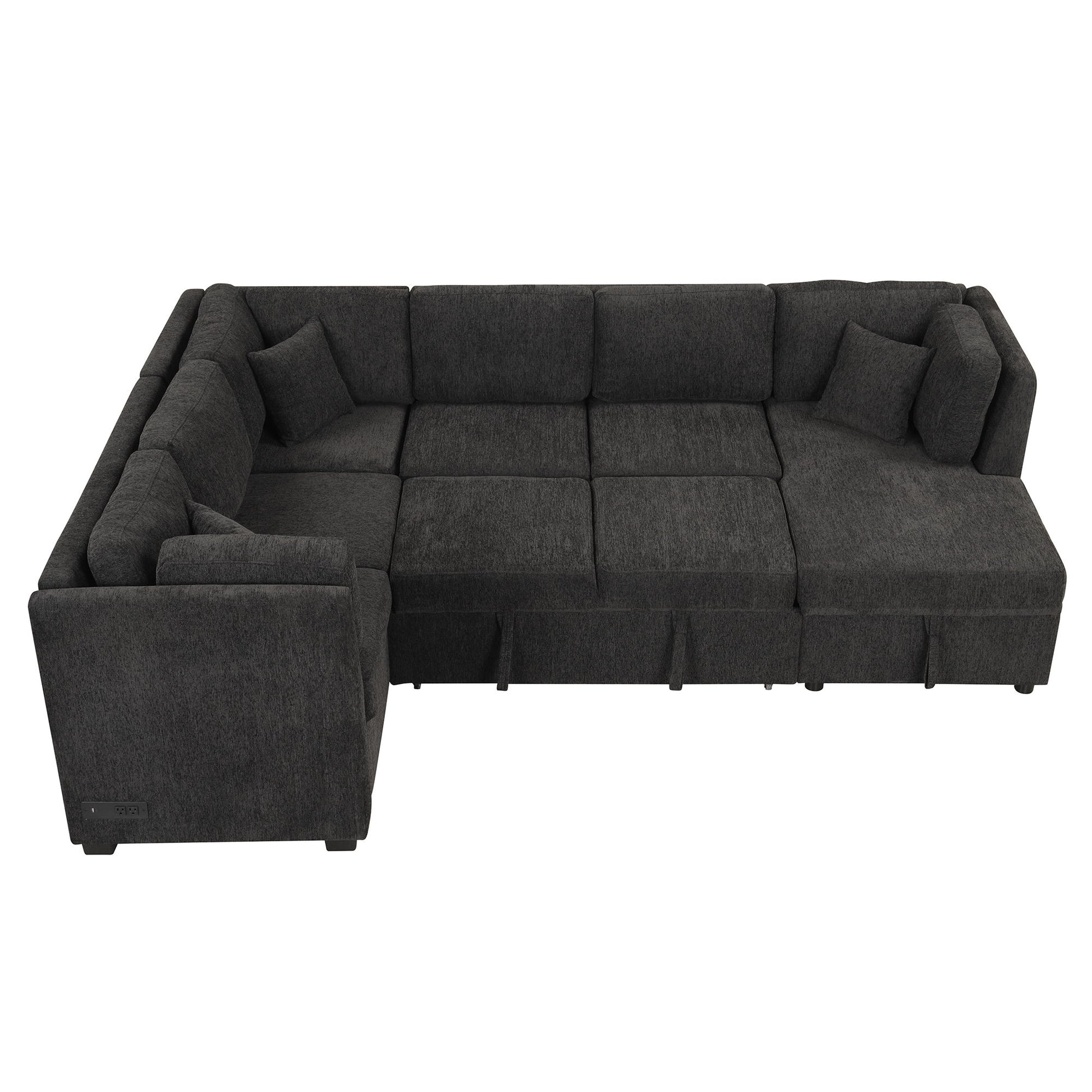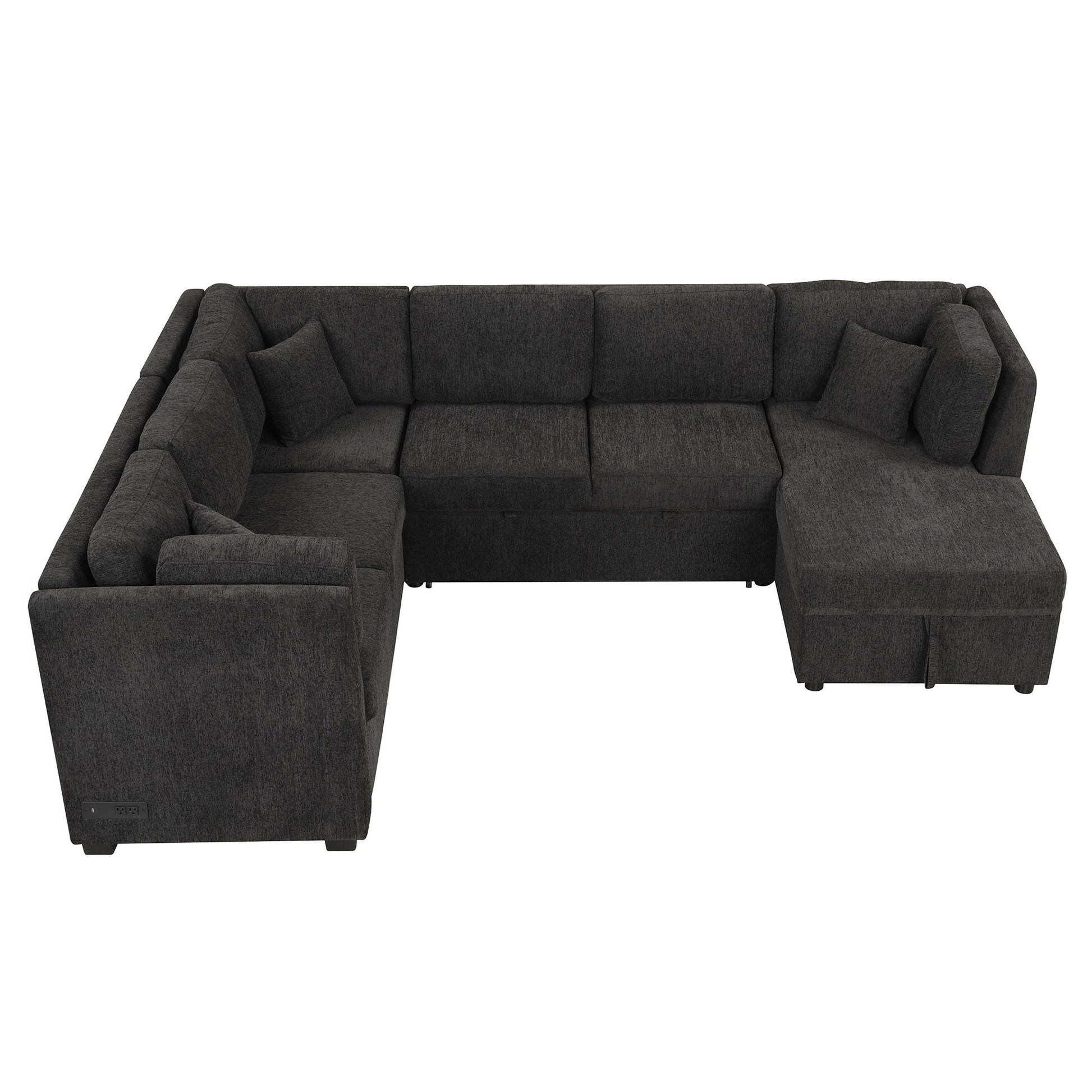 U-Shaped Sectional Sofa Pull Out Sofa Bed With Two USB Ports, Two Power Sockets, Three Back Pillows And A Storage Chaise For Living Room - Black