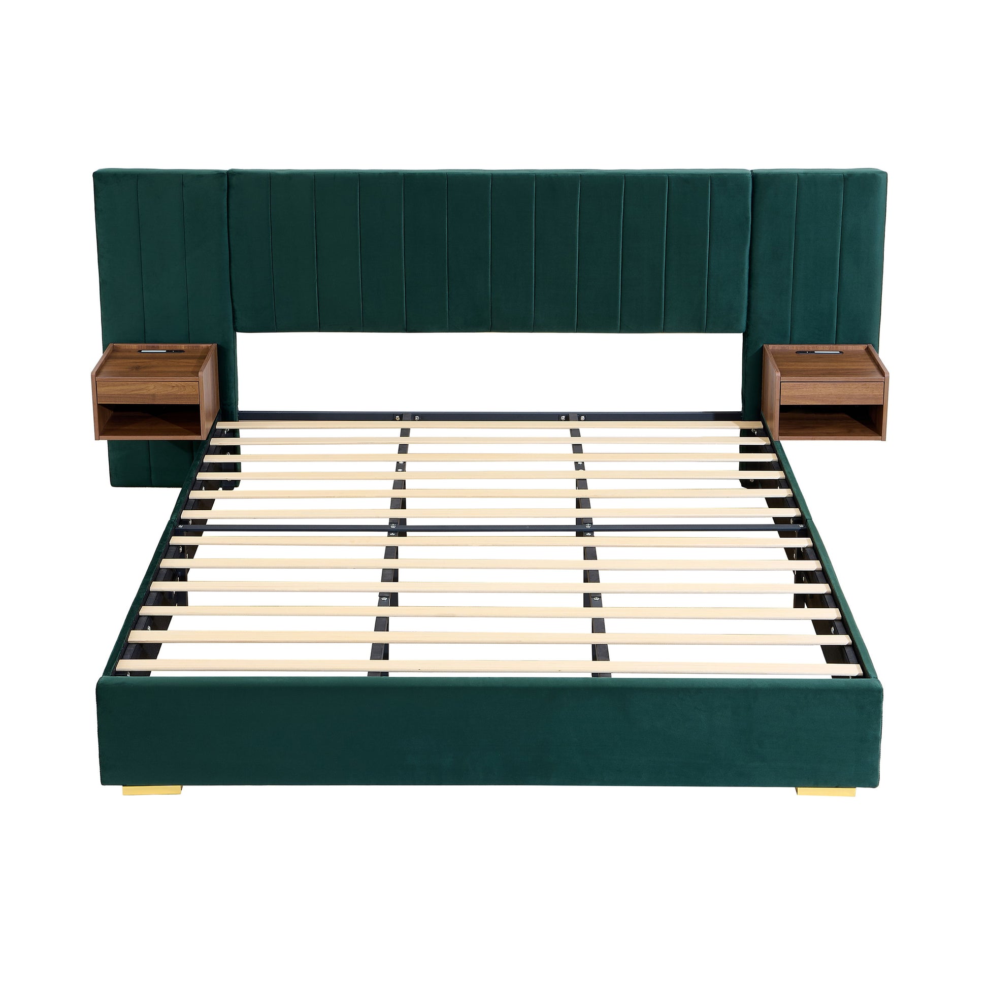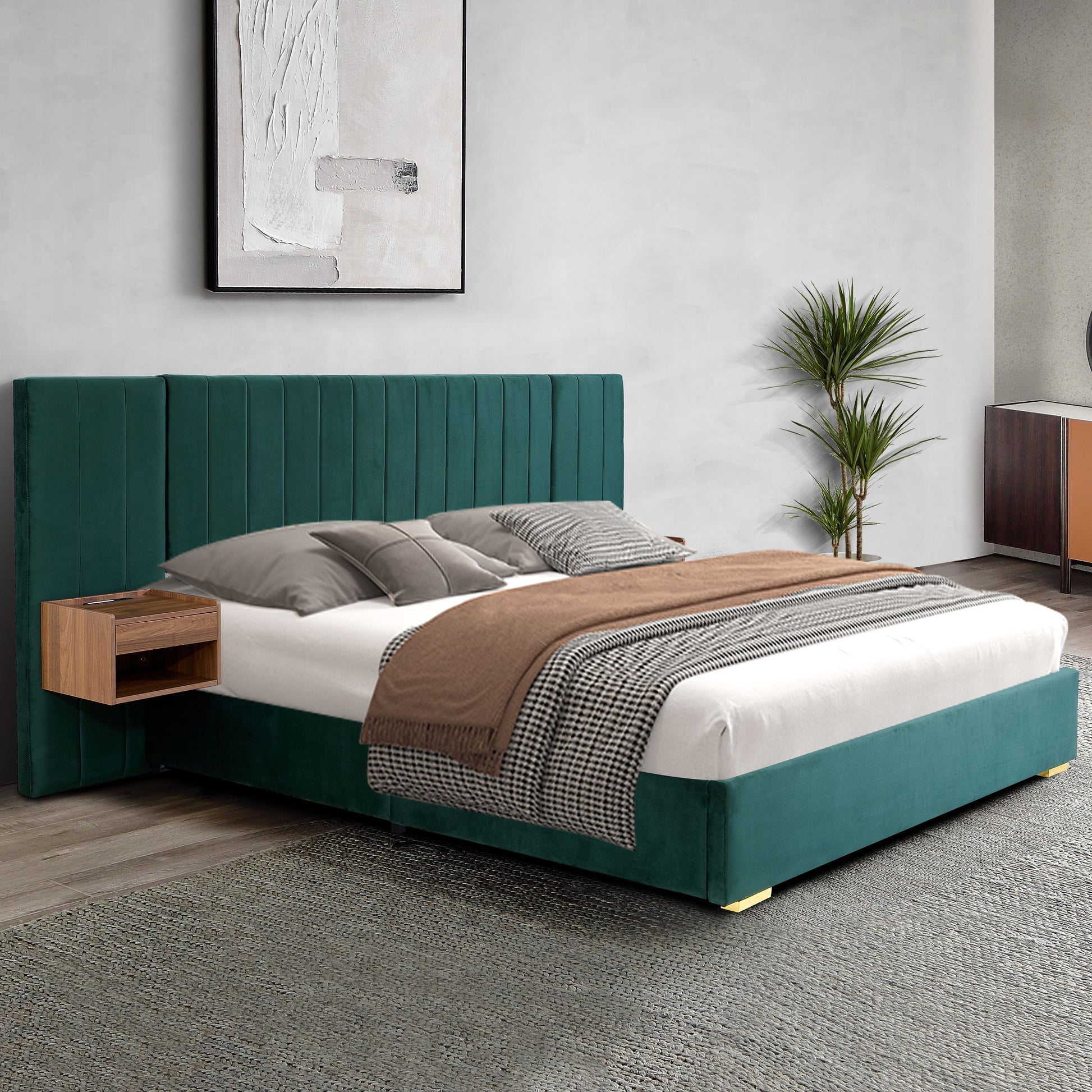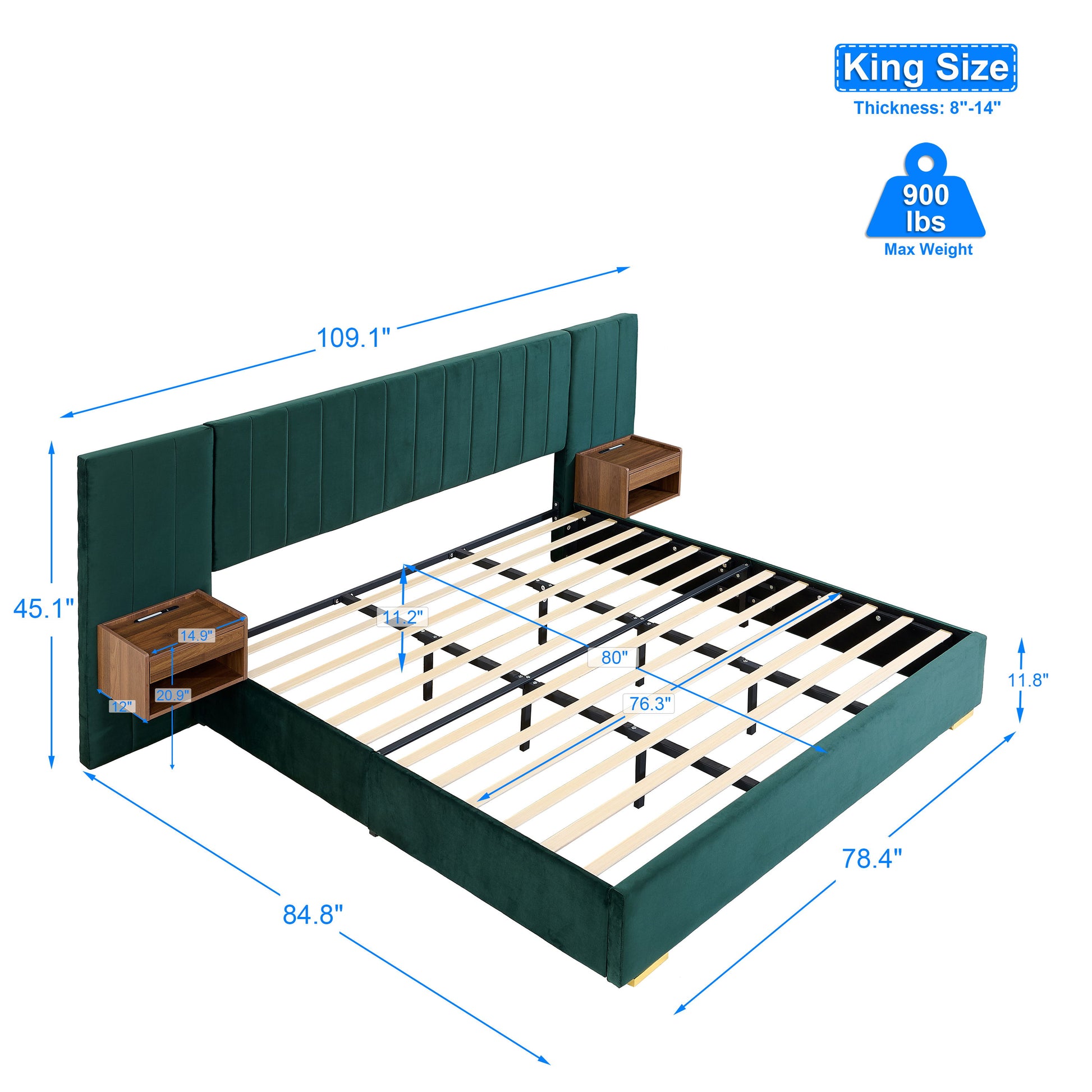 Upholstered King Size Bed Frame Of Velvet Tufted Headboard With Floating Nightstand LED / USB Built-In - Dark Green