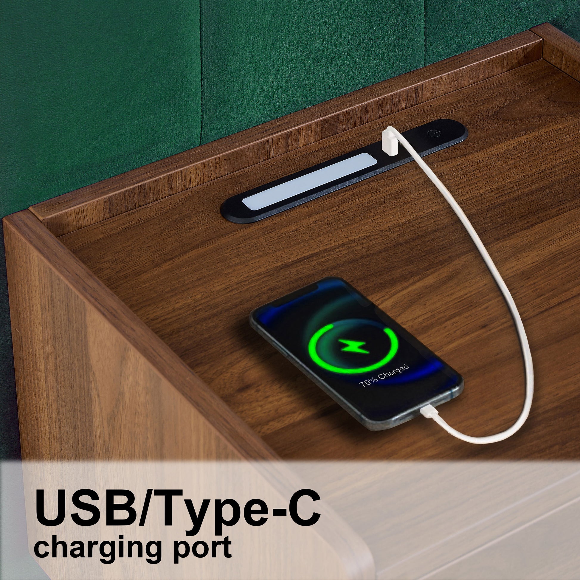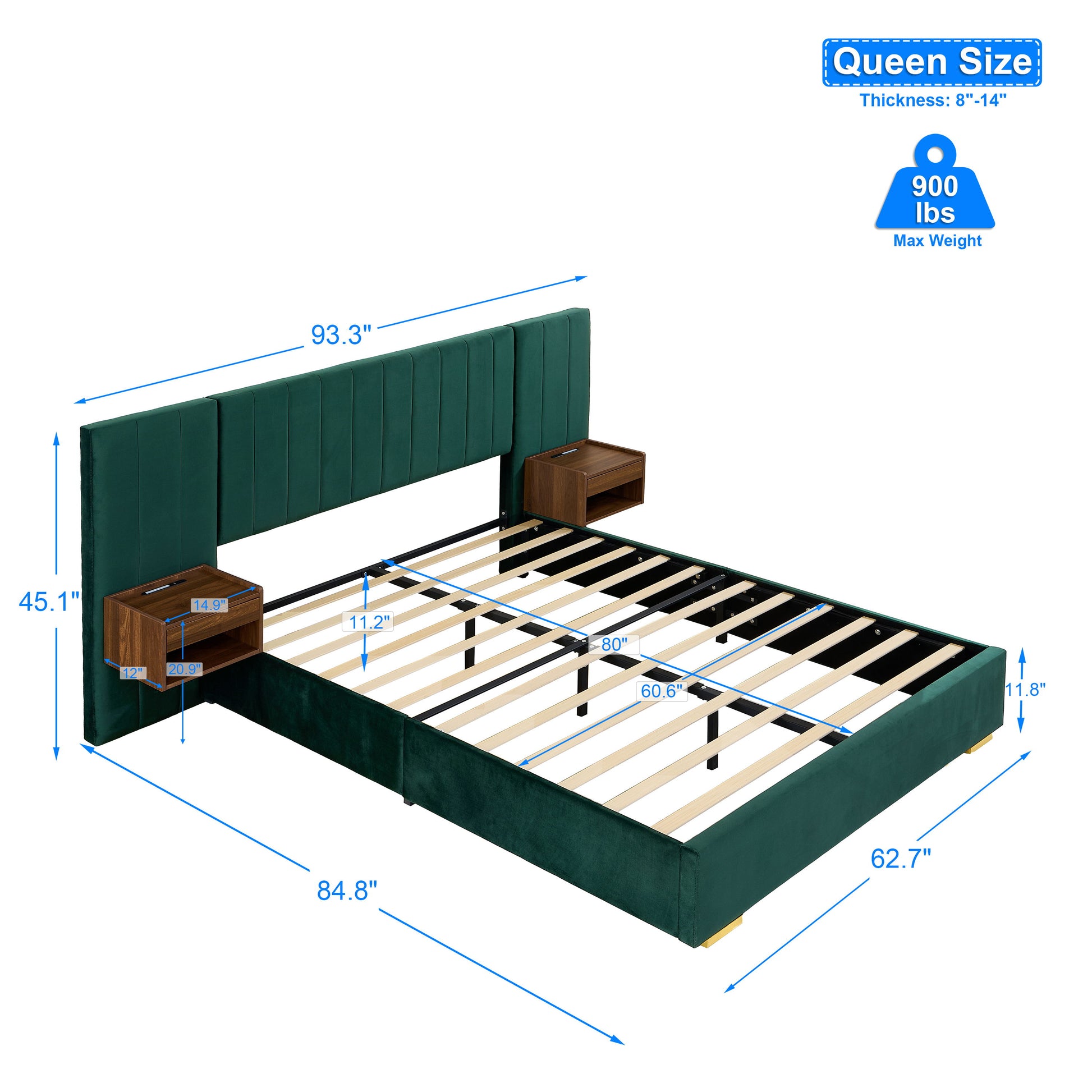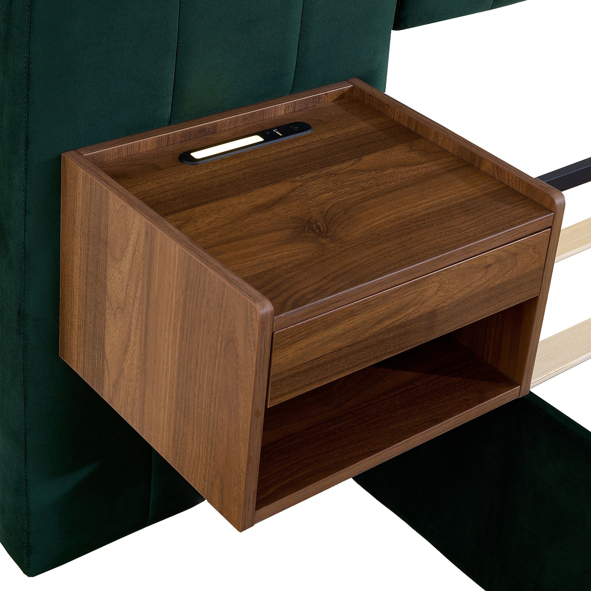 Upholstered Queen Size Bed Frame Of Velvet Tufted Headboard With Floating Nightstand LED / USB Built - Green