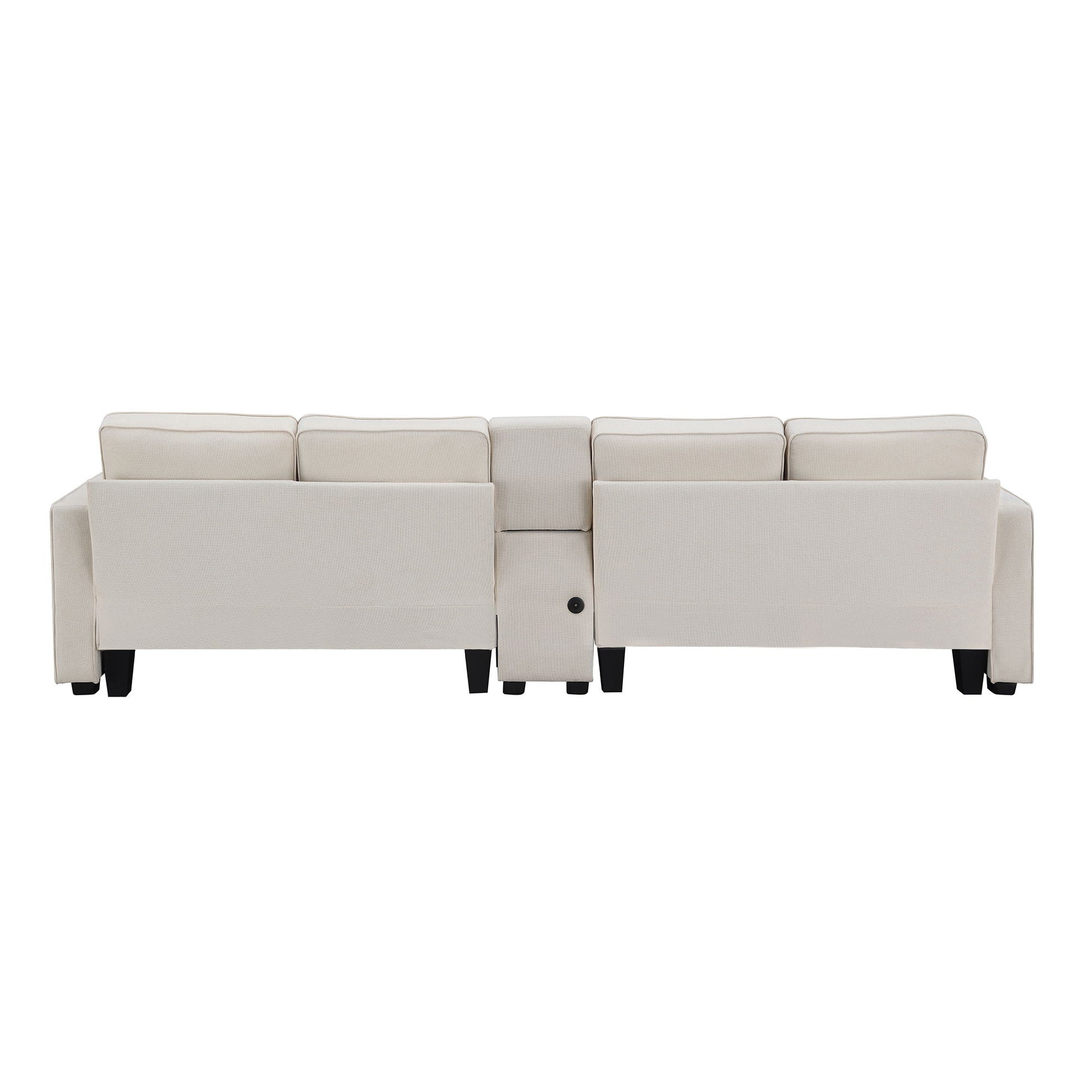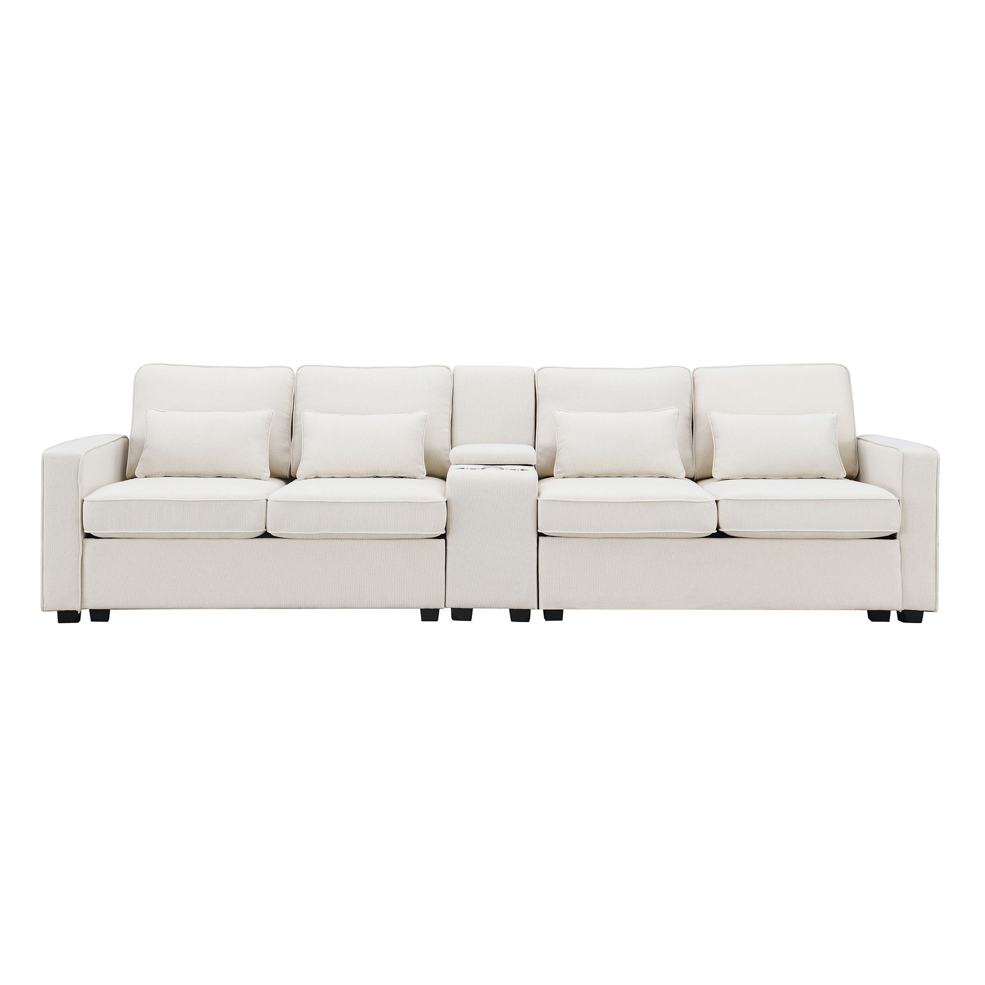 Upholstered Sofa With Console, 2 Cupholders And 2 USB Ports Wired Or Wirelessly Charged, Modern Linen Fabric Couches With 4 Pillows (4 Seat) - Beige