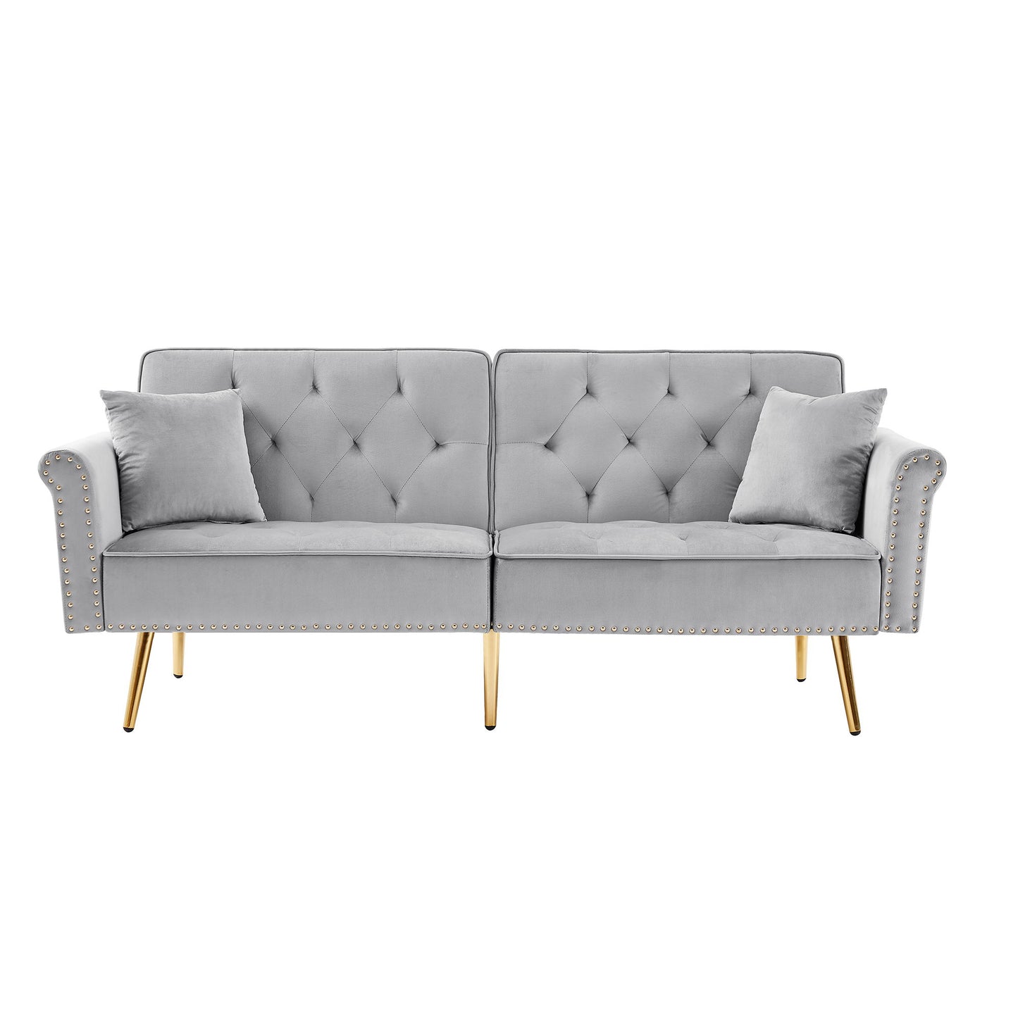 Velvet Tufted Sofa Couch With 2 Pillows And Nailhead Trim - Light Gray