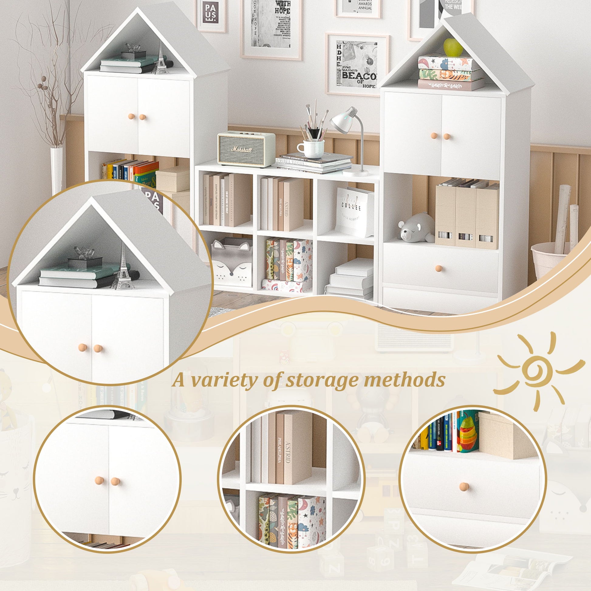 Versatile Children's Bookshelf With House-Shaped Design Multifunctional Storage - White
