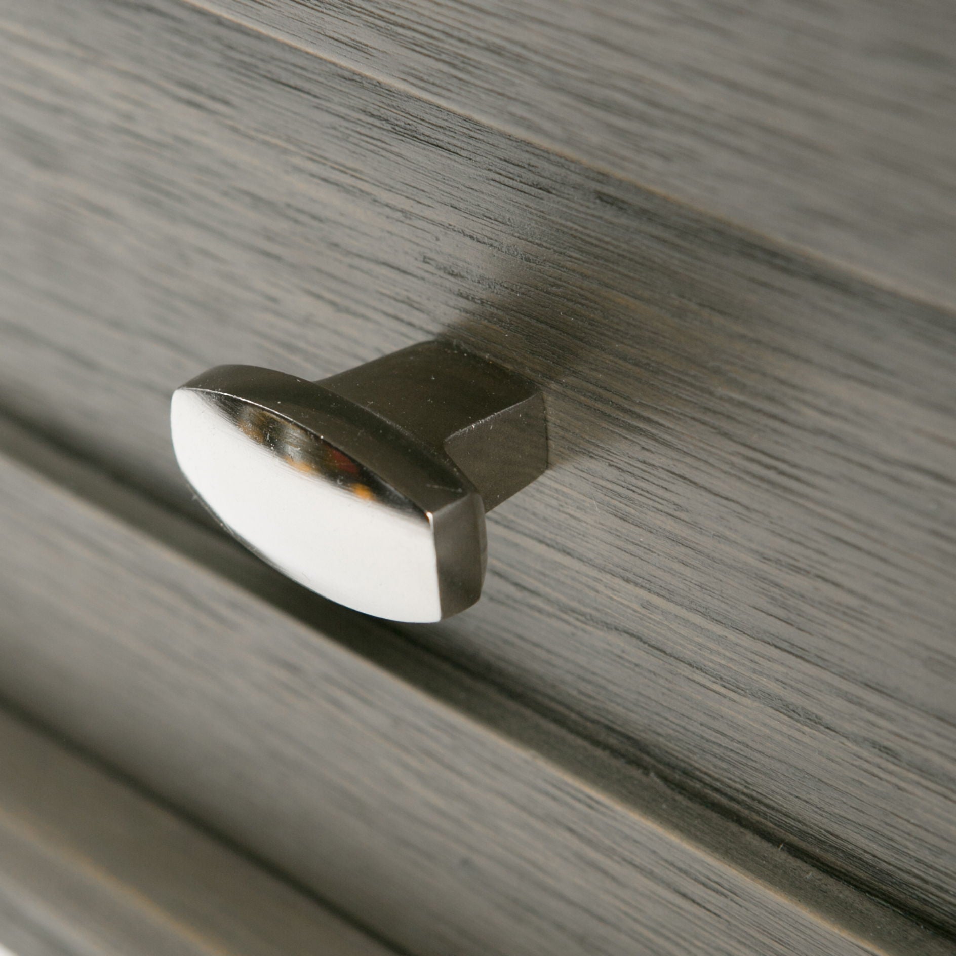 - Transitional design features brushed nickel knob, square tapered legs and square edged table top