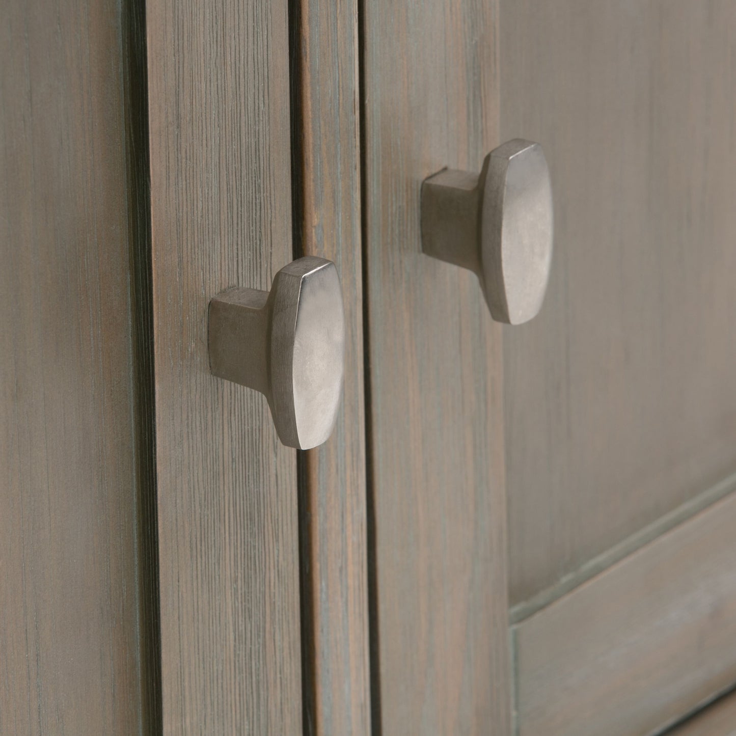 - Transitional Style includes rounded rectangular Brushed Nickel knobs and square tapered legs
