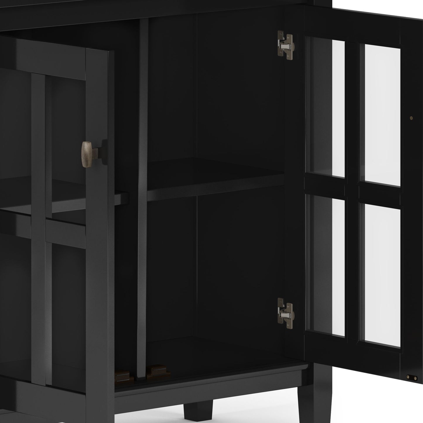 - Features storage compartment with two adjustable shelves behind wood framed tempered glass door