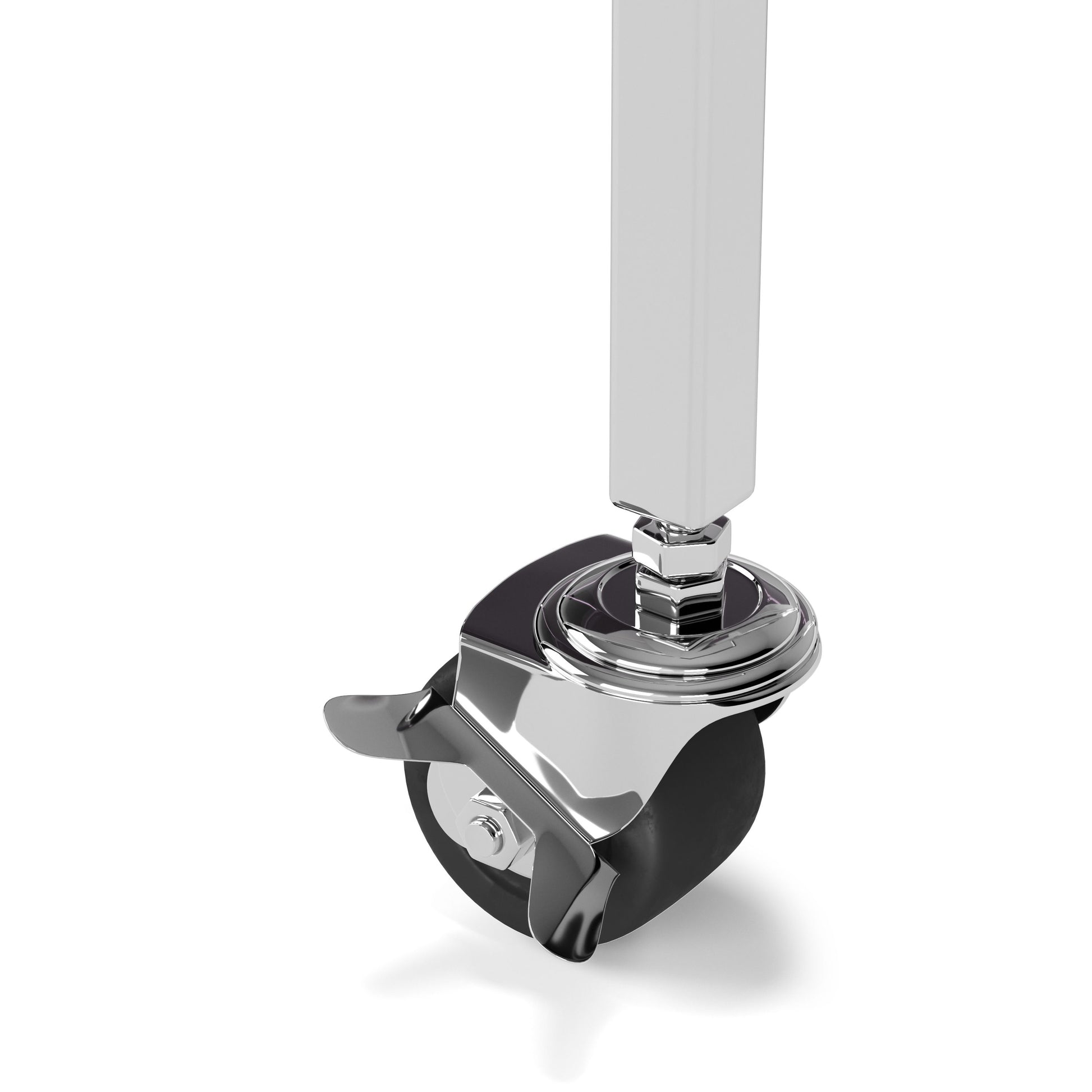 - Features Black toughened glass top and bottom shelves, one rack for hanging glasses, three rings for bottle storage, four caster wheels – two that lock and handle/pull