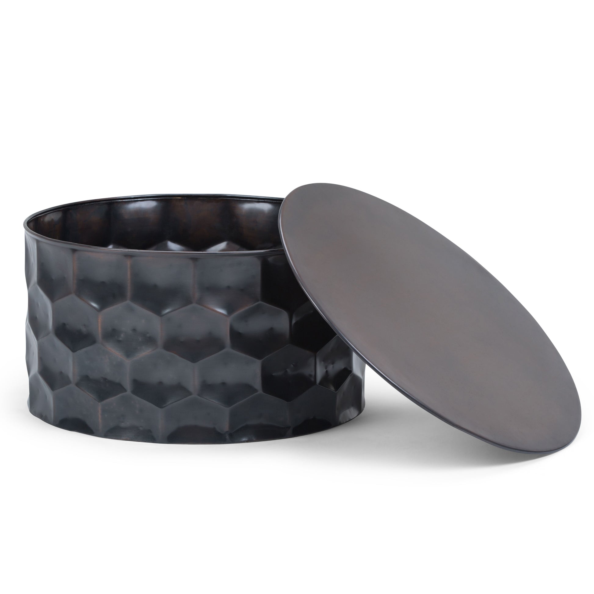 - Features large round shape with removable top that reveals plenty of storage
