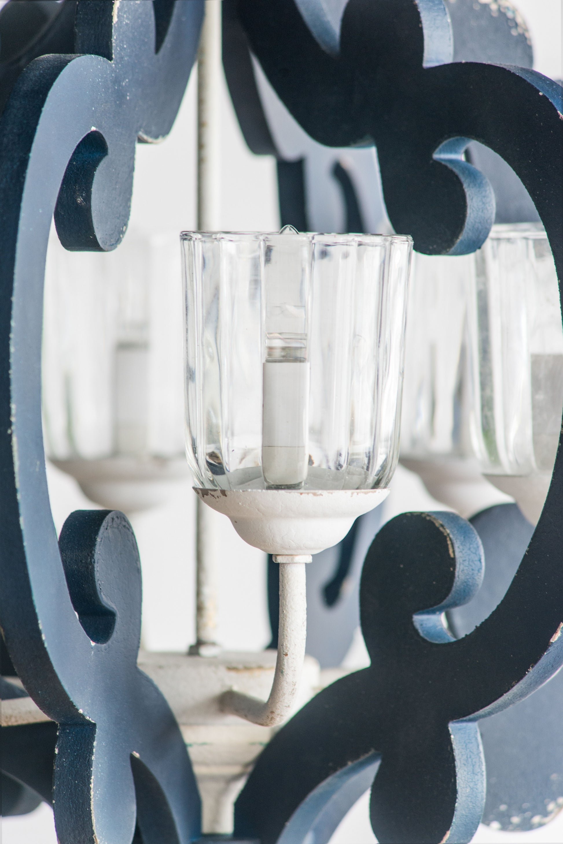 - Design: Blue wooden chandelier with white accents, ideal for cottage or coastal style spaces.