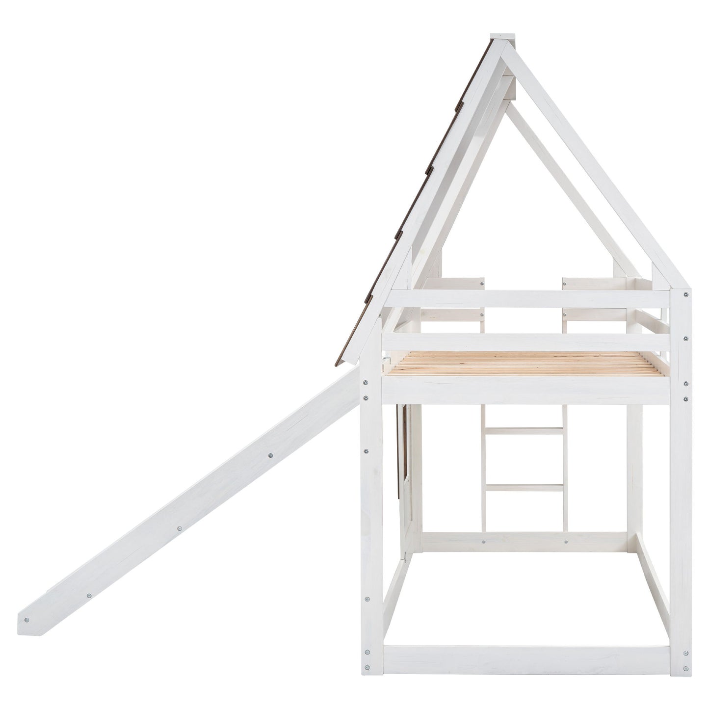 Wood Twin Size House Bunk Bed With Roof, Ladder And Slide - White / Brown
